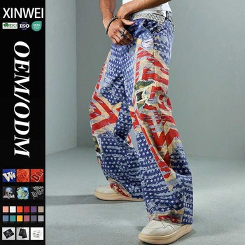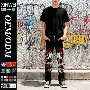 بيع بالجملة مخصص الشارع خمر غسلها الدينيم المتعثرة بنطلون مخصص عبر حجر الراين المطبوعة الرجال الدنيم السراويل الساق واسعة