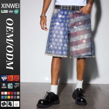 Short en jean surdimensionné de grande taille pour hommes américains de style de rue hip-hop Short en jean décontracté à imprimé graphique avec strass personnalisé pour hommes