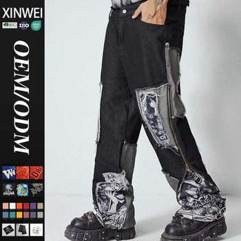Đường Phố Retro Người Đàn Ông Của Đau Khổ Denim Jeans Tùy Chỉnh Thời Trang Chắp Vá Màu Sắc Phim Hoạt Hình In Thiết Kế Dây Kéo Hem Thẳng Chân Jeans